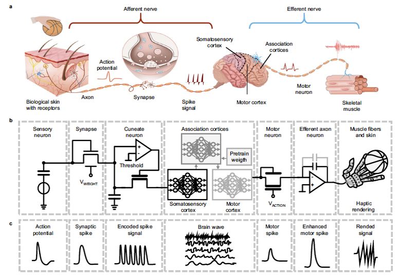 信号与系统的架构设计是定义一个新领域的前提。与传统的力触觉信号与系统不同,类人类皮肤的机器触觉系统是基于神经形态并仿生人类触觉的工作原理。区别于传统模式,信号特性及其处理方式也大不相同,其基础信号是神经尖峰脉冲(Spike)而非传统的数字和模拟混合信号;其计算范式是基于矩阵乘法的模拟计算,而非基于布尔逻辑的冯诺依曼数字计算。