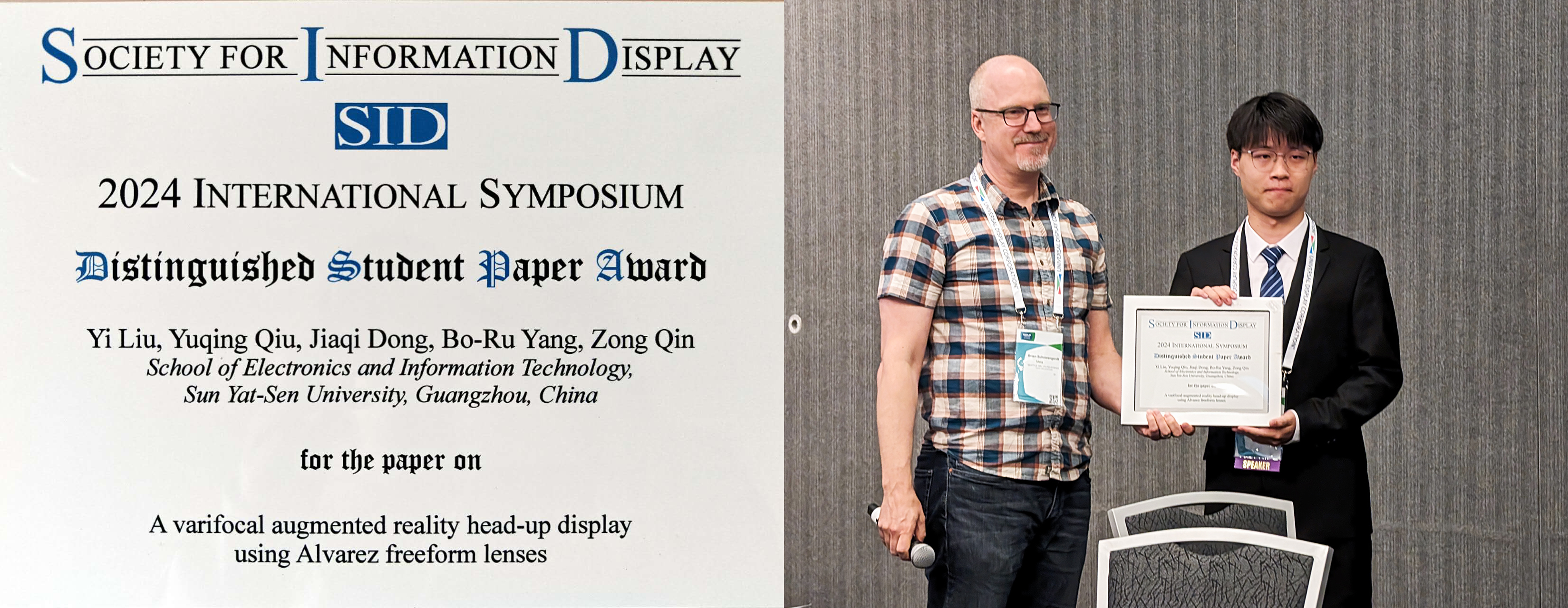该项目主要参与人员还包括刘一同学(网赌 2018级光电本科,2022级电子科学与技术硕博连读)和董家麒同学(网赌 2017级光电本科,2021级集成电路工程硕士)。并且,该项目的研究成果于2024年以论文《Varifocal augmented reality head-up display using Alvarez freeform lenses》在美国圣何塞举办的显示领域顶会SID Display Week获得Distinguished Student Paper Award,刘一同学为第一作者。该奖项获奖率低于5%,获奖人来自斯坦福大学、中佛罗里达大学、Google、Meta、索尼、京东方等一流单位。
