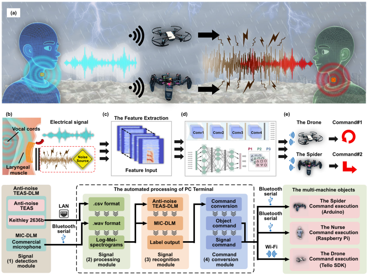 针对现阶段常规人机语音交互在极端噪声环境中的不足,谢曦教授团队设计开发了一种基于深度学习架构增强的柔性抗噪声学传感集成系统,以实现在极端嘈杂环境中的复杂人机协同交互。柔性抗噪声学传感器(Anti-noise TEAS)通过结构优化与缓冲设计,能够以接触式传感的方式,从喉部混合模态振动中捕获人声基频信号,同时有效抑制极端环境噪声的干扰,显著提升了在复杂噪声场景下的语音信号识别能力。在此基础上,团队进一步将Anti-noise TEAS与基于卷积神经网络的深度学习模型(CNN-based DLM)相结合,构建了集成化的Anti-noise TEAS-DLM人机协同系统。该系统不仅实现了对语音信号的高保真解释,还能在极端噪声干扰的虚拟场景和真实场景中,以近乎完美的噪声免疫性能,精准地识别和传输各种语音指令(识别准确率大于99%)。相较于传统的人机语音交互系统,Anti-noise TEAS-DLM具有更为优异的人机协同效率,可以在不同的场地、不同的噪声环境中,高效地引导机器群体系统执行复杂的灾难后救援任务(成功率达100%)。