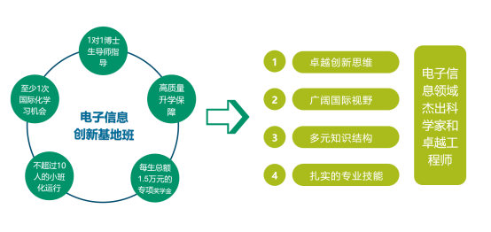 “创新基地班”坚持以学生成长为中心,将通识教育与专业教育相融合,着力培养基础扎实、创新能力优、工程实践能力强,能在电子信息领域引领未来发展的拔尖创新人才。学院为“创新基地班”学生增设进阶课程,并配备一对一博导给学生课程修读、科研训练、学科竞赛、学业规划、生活心理等提供全方位的指导和帮助,引导学生提升社会责任感和使命感,为学生成长成材打下扎实基础。