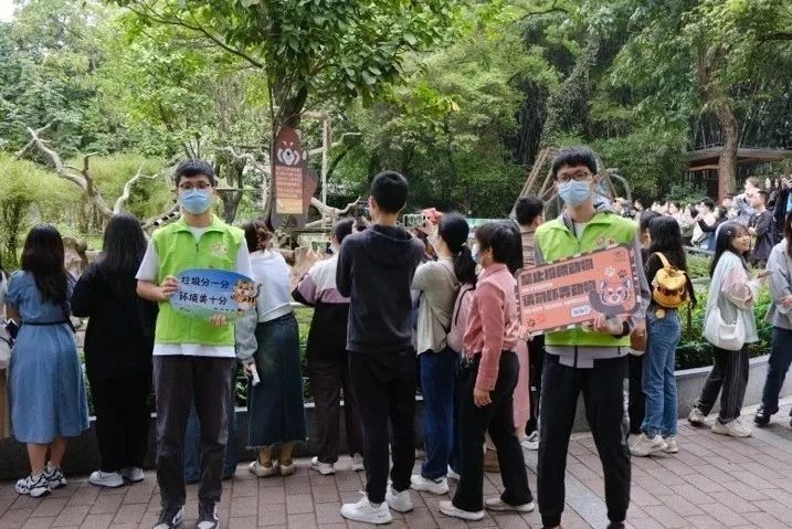大熊猫馆外,志愿者引导客流有序排队
