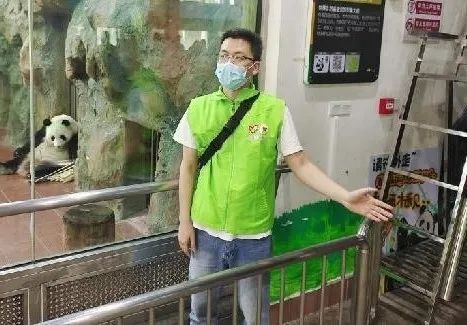 大熊猫馆内,志愿者引导游客文明游览