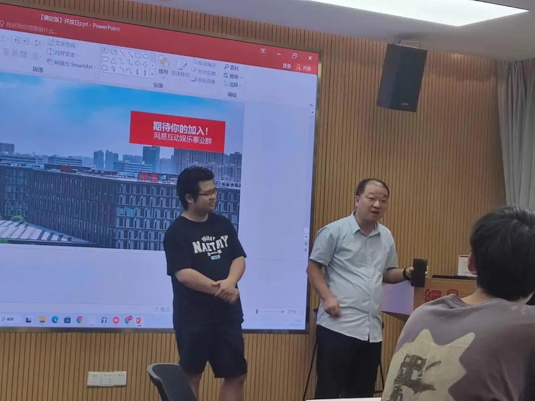 随后,网易的工作人员对网易进行了更加详细的介绍,共分为三个部分:对网易游戏的详细介绍、对网易园区(广州、上海、杭州)进行介绍、对面向大学的校招和实习进行介绍。