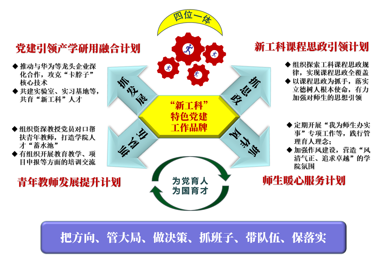 学院党委始终坚持以习近平新时代中国特色社会主义思想为指导,坚决维护以习近平同志为核心的党中央权威和集中统一领导,严格贯彻执行党的路线、方针、政策和决议,全面加强党对学院工作的领导,充分发挥“把方向、管大局、做决策、抓班子、带队伍、保落实”的作用。学院党委以政治建设为统领,推动全面从严治党向纵深发展,坚守为党育人为国育才的根本使命,牢牢把握社会主义办学方向;注重夯实基层党建,不断提升党支部凝聚力和战斗力,打造政治素质过硬的基层战斗堡垒;以创先争优为抓手,充分发挥“头雁效应”,引领学院事业高质量内涵式发展;深入实施新工科党建品牌培育计划,打造“新工科课程思政引领计划、党建引领产学研用融合计划、青年教师发展提升计划、师生暖心服务计划”四位一体、具有新工科特色的党建工作品牌,有力推进党建与中心工作深度融合,奋力开创学院事业发展新局面。