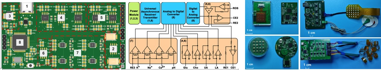 (a)多参数电化学电路仪器:多参数电化学电路平台,能够实现包括葡萄糖、pH、离子和尿酸等多种分析物的检测。集成了电源模块、信号放大器、模拟到数字转换器以及多路复用器等关键电路元件,具备多通道同步检测功能。 生理信号可穿戴设备:(b)微针阵列多参数电化学传感器(c)多通路肌电信号采集装置(d)多通路压电信号传感器。