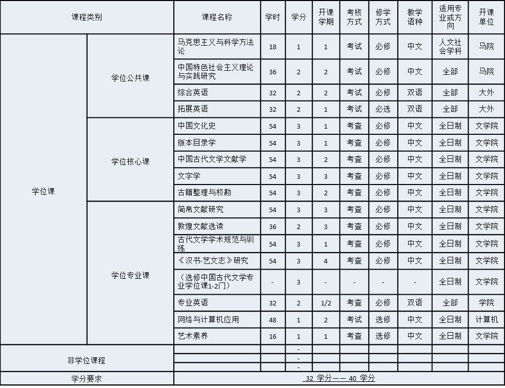 1. 中国古代文学研究生培养实行学分制。课程总学分不少于32个学分,不超过40学分。