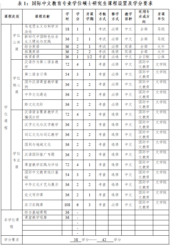 国际中文教育专业硕士学位研究生培养实行学分制,课程设置以实际应用为导向,以国际汉语教师的职业需求为目标,围绕汉语教学能力、中华文化传播能力和跨文化交际能力的培养,形成以核心课程为主导、专业课程为补充、实践训练为重点的课程体系。国际中文教育专业硕士研究生学位课程和非学位课程,其中学位课程分为学位公共课程、学位核心课程、学位专业课程,学位课程成绩70分为合格线。非学位课程不做学分要求。