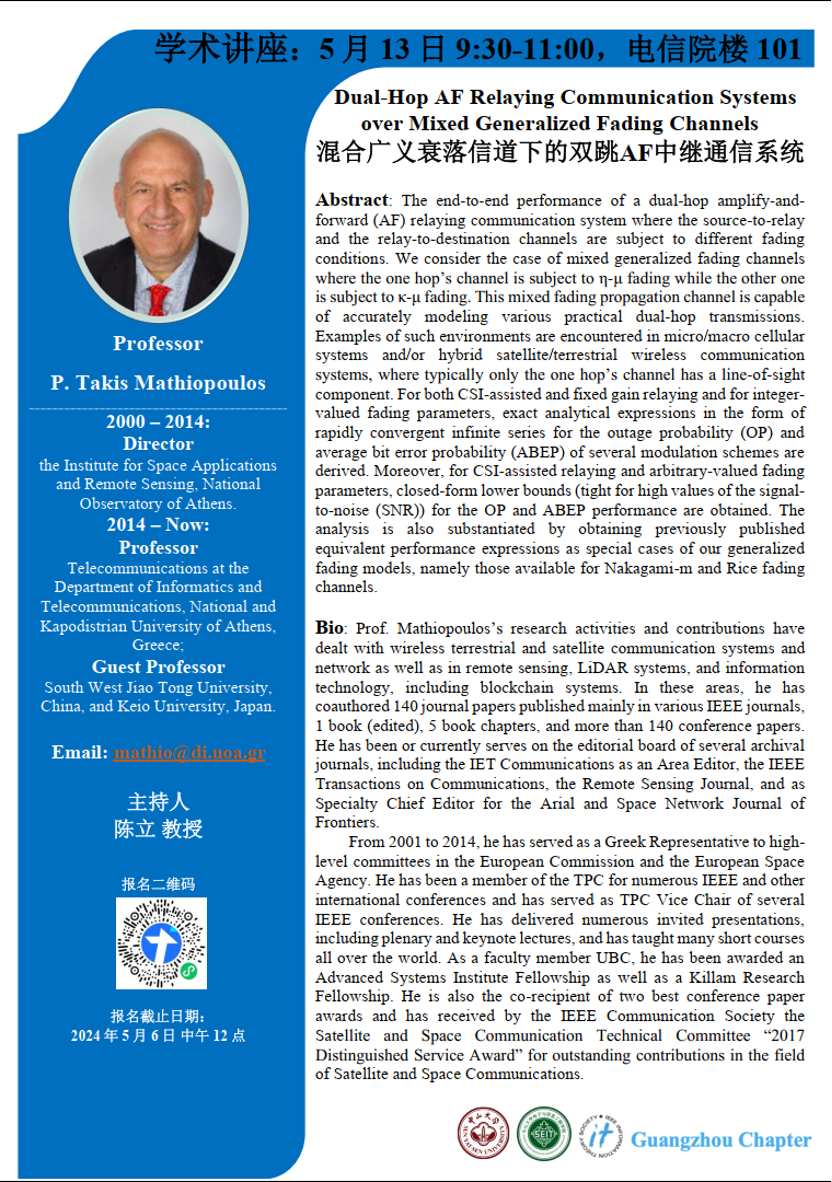 学术报告:(5月13日)混合广义衰落信道下的双跳AF中继通信系统